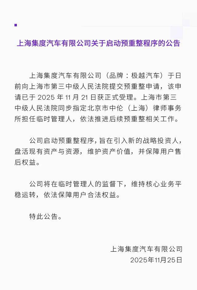 上海市第三中级人民法院近日正式受理上海集度汽车有限公司的预重整申请,这家以极越品牌运营的智能电动车企业,由此开启法治化重组进程。作为百度与吉利联合打造的科技汽车项目,极越的命运转折折射出跨界融合面临的现实挑战,其重组进展备受行业关注。