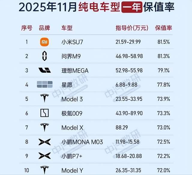 此前,众多车企都热衷于宣称自家车型的二手保值率领先。以小米SU7为例,去年它曾荣登二手保值率榜首,雷军还为此特意发文分享这一喜讯。然而,如今市场格局发生了变化,小米SU7的二手保值率排名大幅下滑,从曾经的榜首位置降至第7名,保值率从81.5%降至76%,相当于下降了5.5个百分点。按照市场行情估算,这意味着一台二手的SU7差不多要少卖1万块钱。