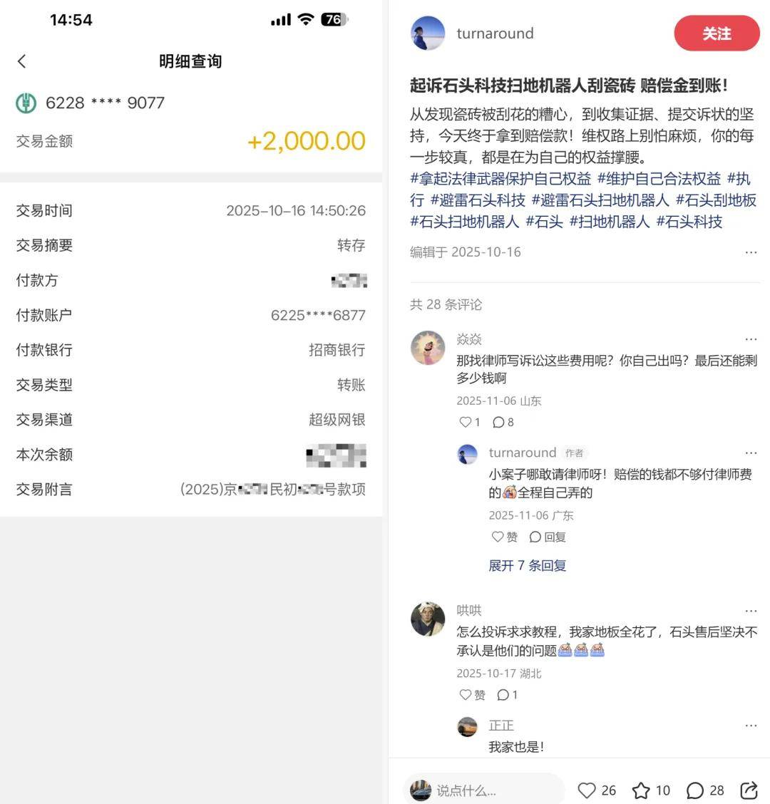 为了固定证据,戴先生化身“侦探”,最长一次连续跟拍机器工作47分钟。每当听到剐蹭声,便立即暂停设备,跪地比对划痕位置。这些视频资料最终成为关键证据。2024年7月,他正式起诉石头科技。经过一年拉锯,2025年10月,法院二审开庭后石头科技主动撤诉,一审判决生效。法院认定,企业未能证明产品无缺陷,而戴先生提供的证据链完整,证明机器人旋转拖地功能是造成划痕的直接原因。最终,石头科技被判赔偿2000元。