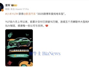 小米YU7斩获2025微博年度纯电车型殊荣,雷军致谢并分享亮眼交付成绩
