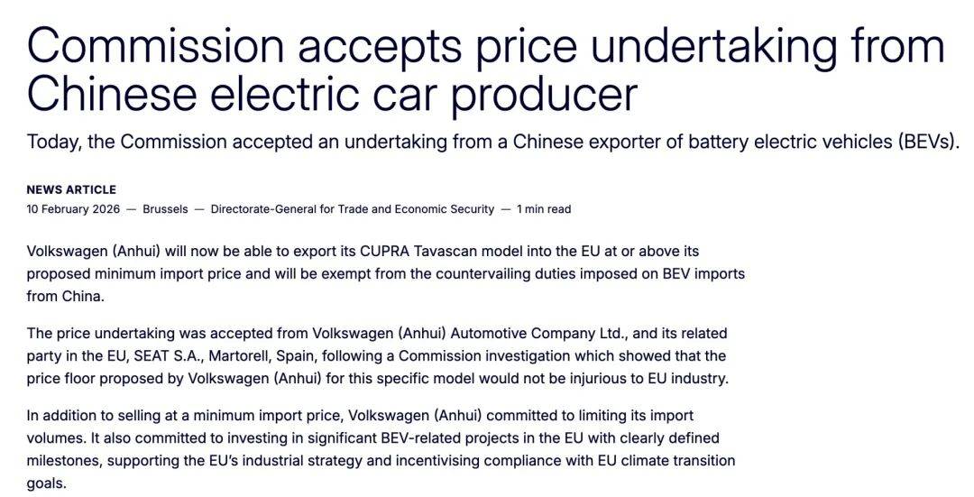 欧盟委员会近日宣布,已正式接受大众汽车(安徽)有限公司提交的电动汽车价格承诺方案。根据该方案,大众旗下CUPRA Tavascan车型将通过设定最低出口价格的方式,免于被征收最高达20.7%的反补贴税。这一决定标志着中欧电动汽车贸易争端在价格承诺机制下取得实质性进展。